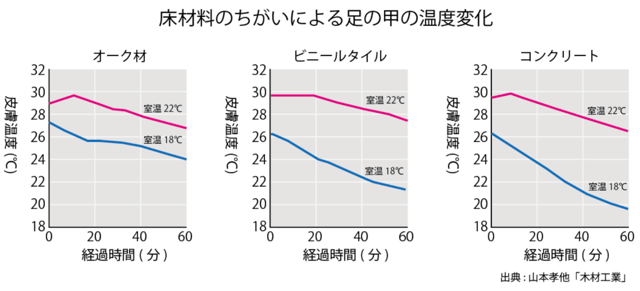 例えば無垢フローリング材料であるオークの熱浸透率は500(J/s0.5m2K)と、鉄筋コンクリート2250(J/s0.5m2K)の約5分の1であり、冬季に床温度が低くなっていても、足裏から熱が奪われにくいため、心地よく感じます。