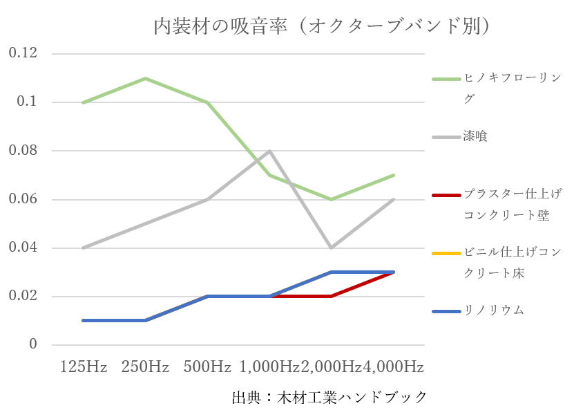 内装に木材を多用した場合、木材は多孔質構造のため、高温から低温まで幅広く吸音するので、残響音が減衰してコンクリート仕上げなどと比べて音場が安定します。そのため、最近では公共建築物でも内装の木質化が推奨されています。