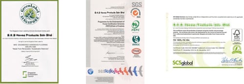 このようにマレーシア全体が環境への意識が高く、そしてウェルネストホームの選んだ工場はさらに突っ込んで環境保護を高く掲げ、生産ラインの労働環境にも注意を払っています。また、高性能なドイツ製マシンを使用しており、ヨーロッパの市場との取引実績が豊富という条件をクリアーしています。 もちろん、FSNをはじめ、PEFC、MTCC、Green Label Singapore、ISO9001/2008,ISO14001/2004 Standards of environmental managementなどの多くの持続可能な森としての認証を取得しています。