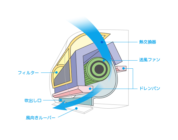 熱交換器が冷たければ冷たい空気が、熱ければ暖かい空気が、熱交換器の下にある送風ファンによって、吹き出し口から出てきます。風の向きを調整するのは、吹き出し口についているルーバーです。