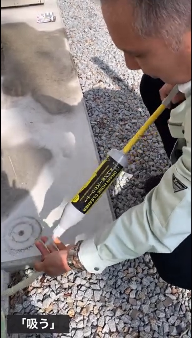 - 注射器のようにドレンホースクリーナーを引いて、汚れを「吸う」