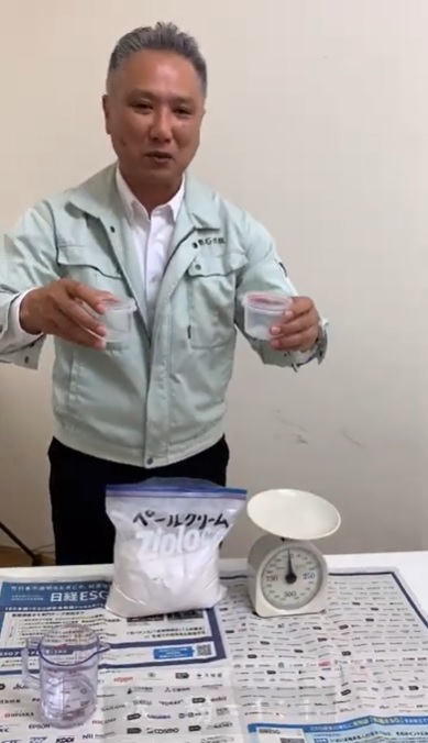 しっくいは、しっくいの粉10gと水10g、というふうに、1:1の割合で混ぜ合わせて作ります。小さな容器に入れると量りやすいですね。