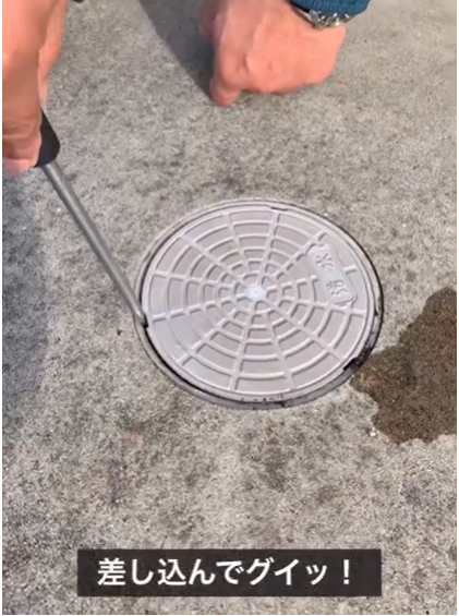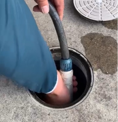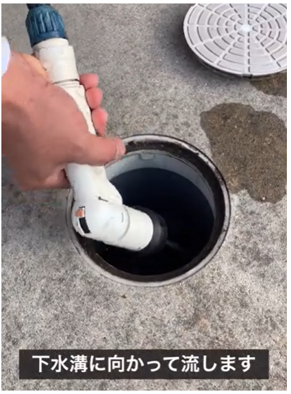 フタを開けたら水を流します。なるべく強い勢いで、下水溝のほうに向かって流してください。