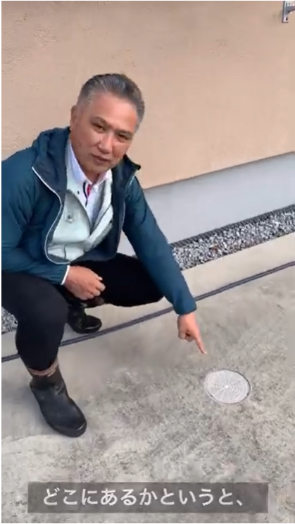 まず、配管の場所を確認します。配管はトイレやお風呂から、下水管や浄化槽に向かって緩やかな勾配で伸びています。どこにあるかというと、ここです。お家の周りに「汚水」または「おすい」と書いてあるフタがありますので、すぐに見つけられるのではないでしょうか。
