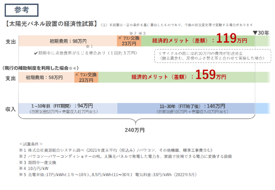 その場合、太陽光パネルを設置する際にかかる初期費用 約98万円が10年程度で回収可能とされています。現行の補助金10万円※を利用すると6年間での回収が可能となります。