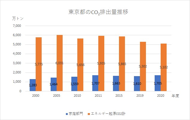 現状どうなっているかと言いますと、東京都環境局の統計では2020年度の都内のCO2排出量は、エネルギー起源CO2で2000年度比は11.7 %減少しています。一方で家庭部門は32.9%増加しています。