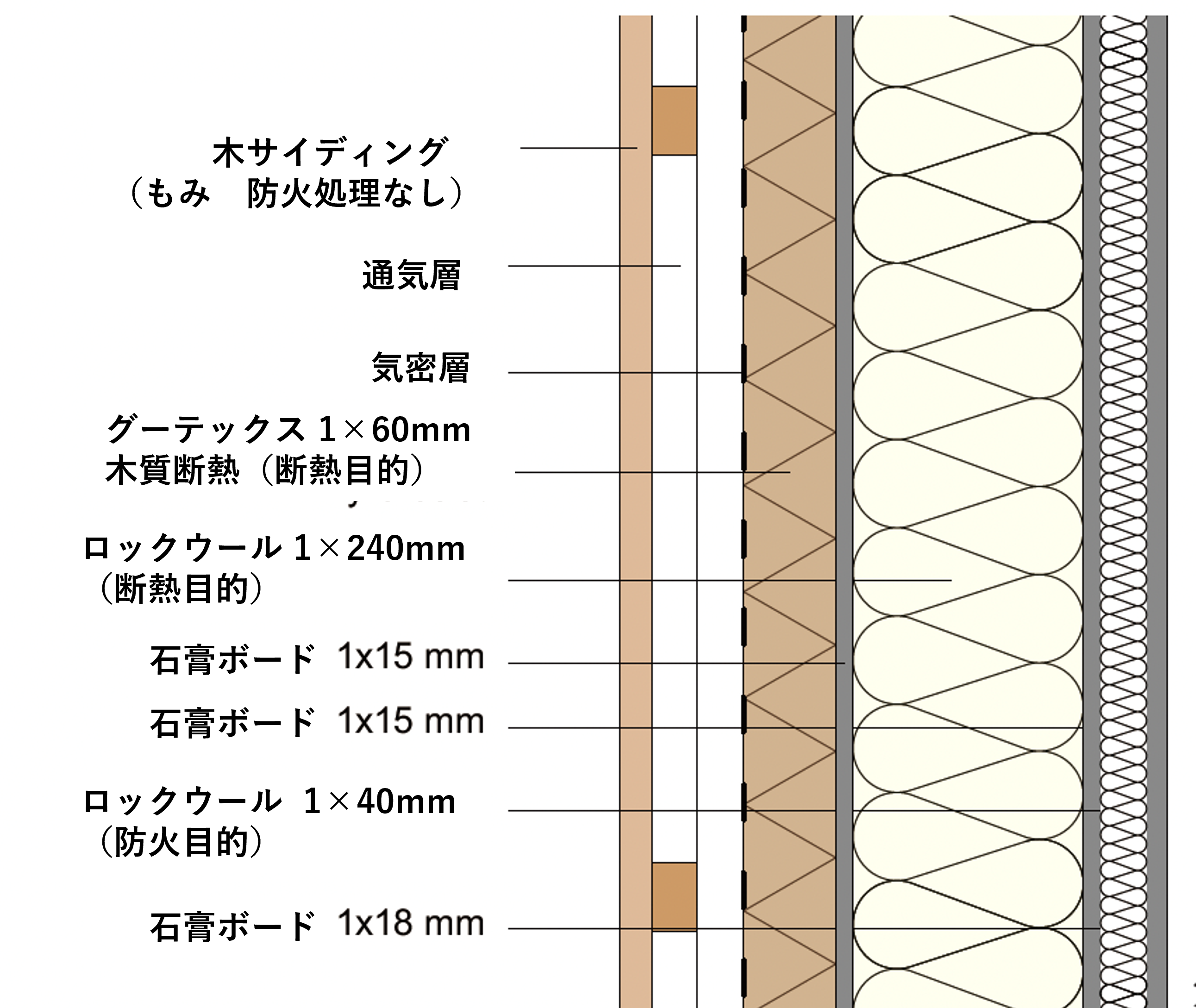 壁構造は、図の左側が外側になります。外側から順に、木サイディング、グーテックス社製の木質断熱材、石膏ボード、ロックウール、石膏ボード、ロックウール、石膏ボードとなります。室内側はロックウールを石膏で挟み、防火性を高めています。