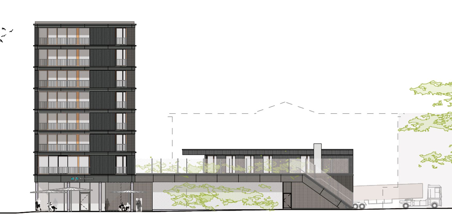 「ブッキンガーストラーゼ52」は、地下1階、地上8階建て。1階にスーパーマーケットが入居し、2階に保育園、3階〜8階が福祉系の賃貸住宅という複合施設です。