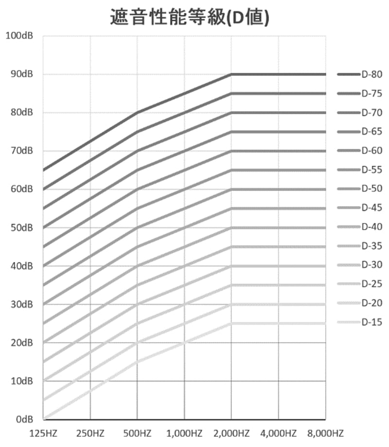 建築では遮音性能の評価には「D値」または「T値(サッシ)」という値で表現します。 D値とは2室間の遮音性能を表す数値です。 125Hz、250Hz、500Hz、1000Hz、2000Hz、4000Hzの6帯域を個別に測定し、遮音基準曲線にあてはめて6帯域のすべての測定値が、基準曲線の内に収まる最大値を「D値」と呼びます。