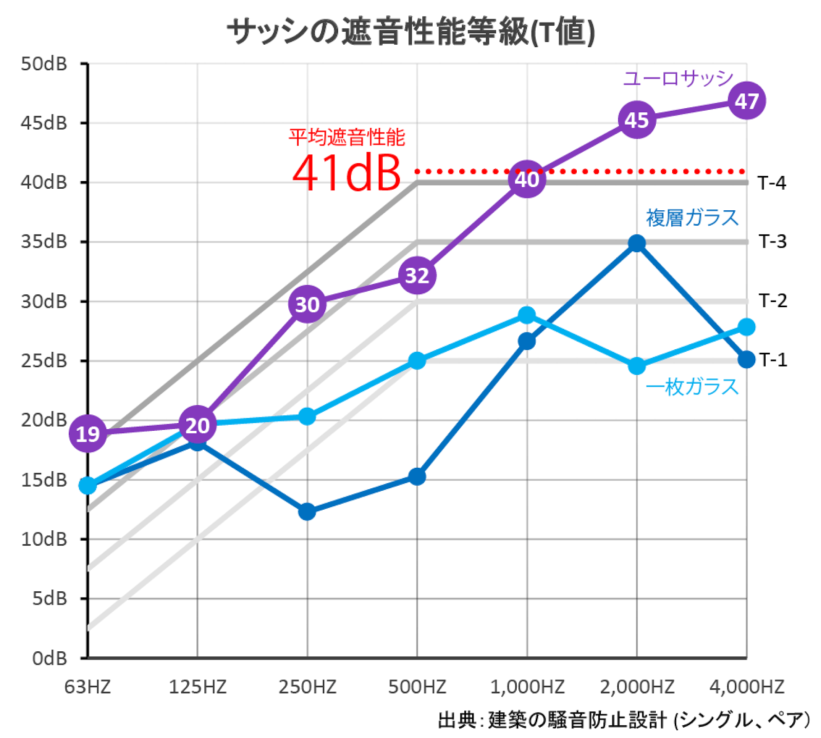 このdB(デシベル)とHz(ヘルツ)が理解できると、ウェルネストホームの標準仕様であるユーロサッシの性能が分かりやすく把握できると思います。