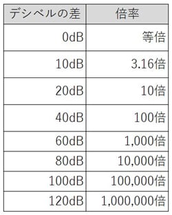上の図はデシベルと実際の音の大きさの一覧表です。例えば10dB差は3.16倍、20dB差は10倍もの差になります。図書館でおしゃべりすると怒られるのは、図書館よりも10倍うるさくなってしまうからですね。