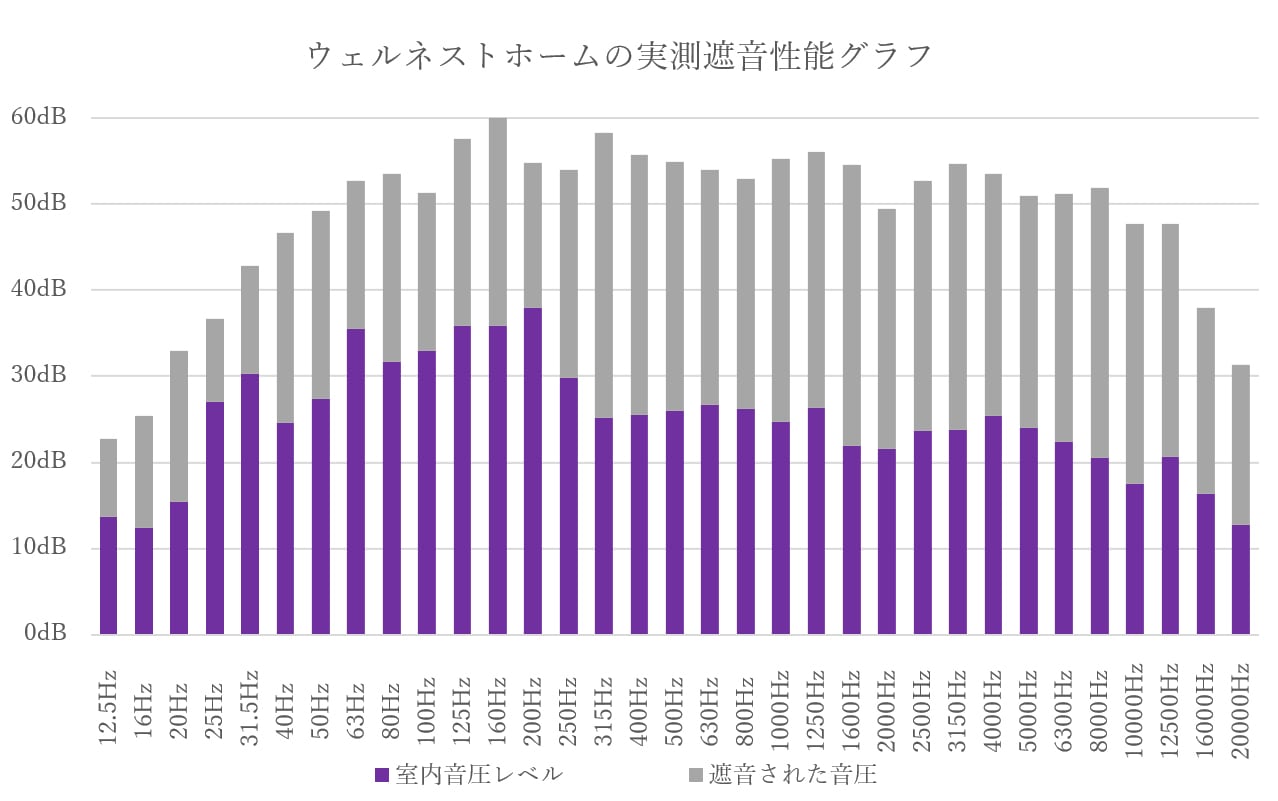 以下のグラフは幹線道路沿いに建設されたウェルネストホームにて実測した遮音性能グラフ*1)です。紫色が室内で聞こえる交通騒音レベル、グレーの部分がウェルネストホームによって遮音された音圧レベル、紫+グレーの合計が、外部における交通騒音レベルです。