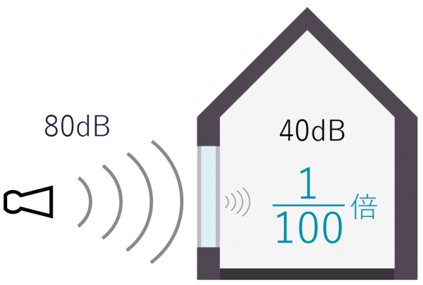 音源音圧 測定音圧 遮音性能 80dB – 30dB = 50dB