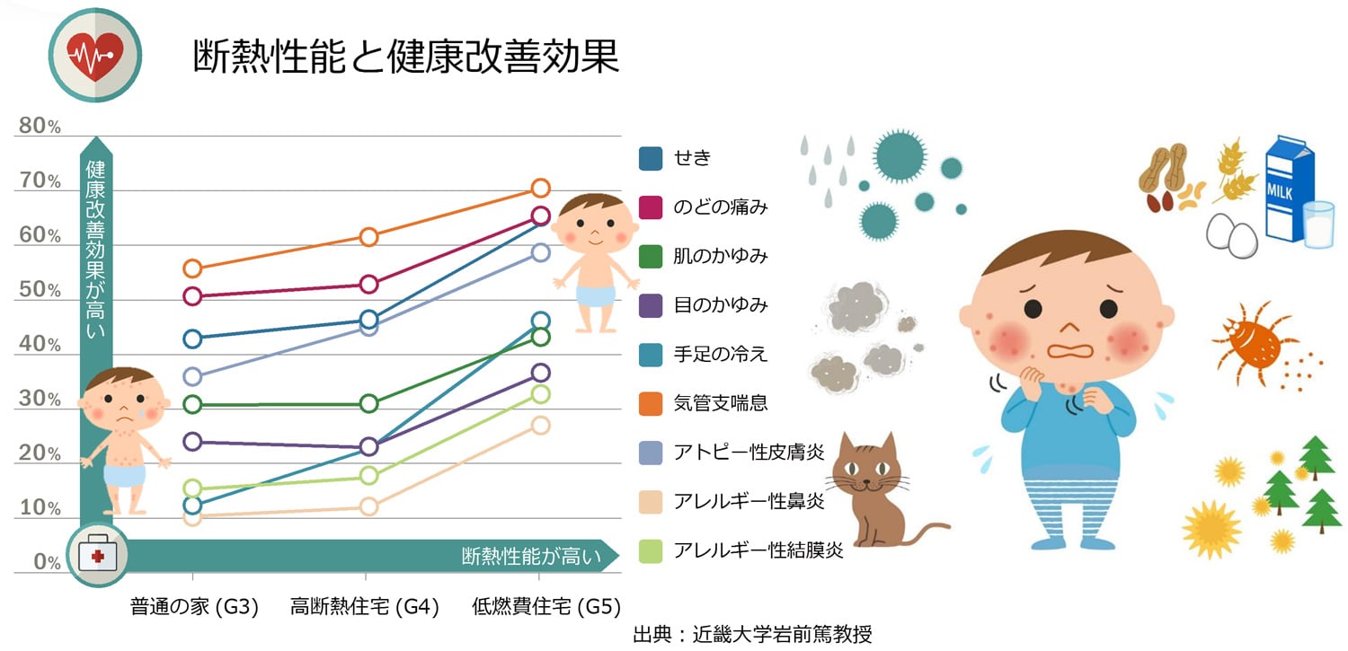 近畿大学岩前篤教授により、断熱性能を3等級、4等級、4等級以上と向上させていくと、気管支喘息やアトピー性皮膚炎、アレルギー性鼻炎等の症状が右肩上がりに改善していくといった調査報告が発表されております。