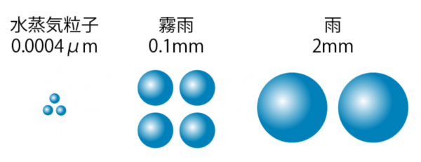 私たちの周りの空気には必ず水蒸気が含まれており、この水蒸気は0.0004μm(1μmは1,000分の1ミリ)という非常に小さい粒子で、肉眼では見ることは出来ません。(よくお湯から発生している湯気が水蒸気だと思っている方が多いのですが、あれは目に見える程度のサイズの小さな水滴が空気中に対流しているものであって、水蒸気ではありません)