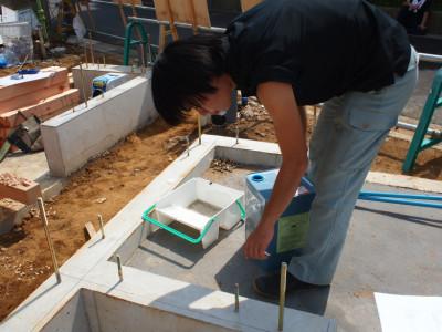 コンクリート強度は、水とセメントの水和反応によって時間をかけて発現します。水が供給され続けば水和反応は進行し、時間経過とともに強度は増大していきます。 しかし、 コンクリート中の水が乾燥で失われてしまうと水和反応は停止するため、基礎から水分が蒸発しないように保護をする「湿潤養生」という作業が必要になります。 基礎は乾かしてしまうと強度が低下しますので乾燥はNGです。そして、温度が低くても強度が低下しますので保温が必須です。 そのため、コンクリート打設後の断熱と湿潤状態を保つための「湿潤養生期間」と「湿潤養生方法」が基礎の耐久性を決める重要なポイントとなります。 特に打設後の7日間が最も強度形成される速度が速い期間ですので、7日間の湿潤養生期間の管理方法が最重要となります。 ウェルネストホームでは、夏期は常に水を散水して基礎を水没させる、「湛水養生」という基礎養生を行い、コンクリートの水和反応を促進させています。