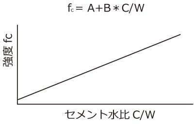 コンクリートは、骨材同士をセメントペーストで結合したものです。従って、コンクリートの強度はセメントペーストの接着力、つまり水セメント比(水とセメントの割合)によって決まります。水セメント比が小さいほど(セメント割合の多いほど)、高濃度のセメントとなり、コンクリート強度は大きくなります。