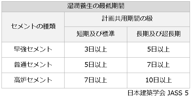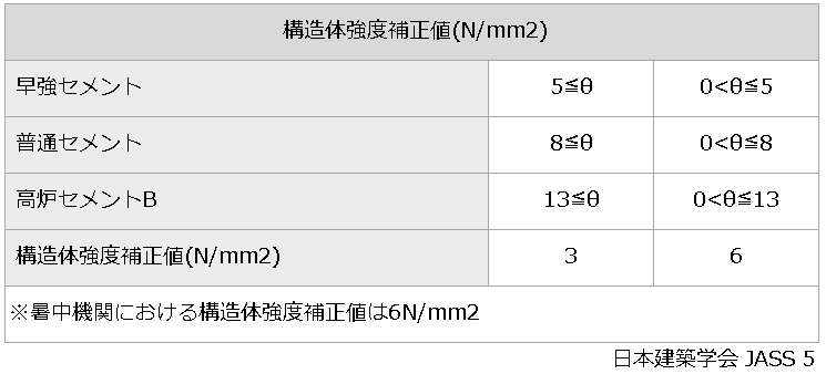 そのため、打設した時期によって呼び強度から補正値を差っ引いた値を設計強度とします。なお、夏は温度が高いのですが水分も蒸発しやすいために、逆に乾燥しすぎるので、最も厳しい補正係数は6N/mm2となっています。