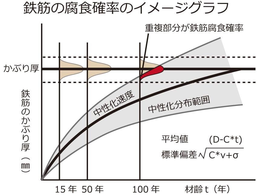 コンクリートはアルカリ性なので、コンクリートが中性化するまでは中の鉄筋は錆びません。ということで、コンクリートの中性化領域が鉄筋に到達し、約20%が腐食した状態が鉄筋コンクリートの寿命と考えられています。