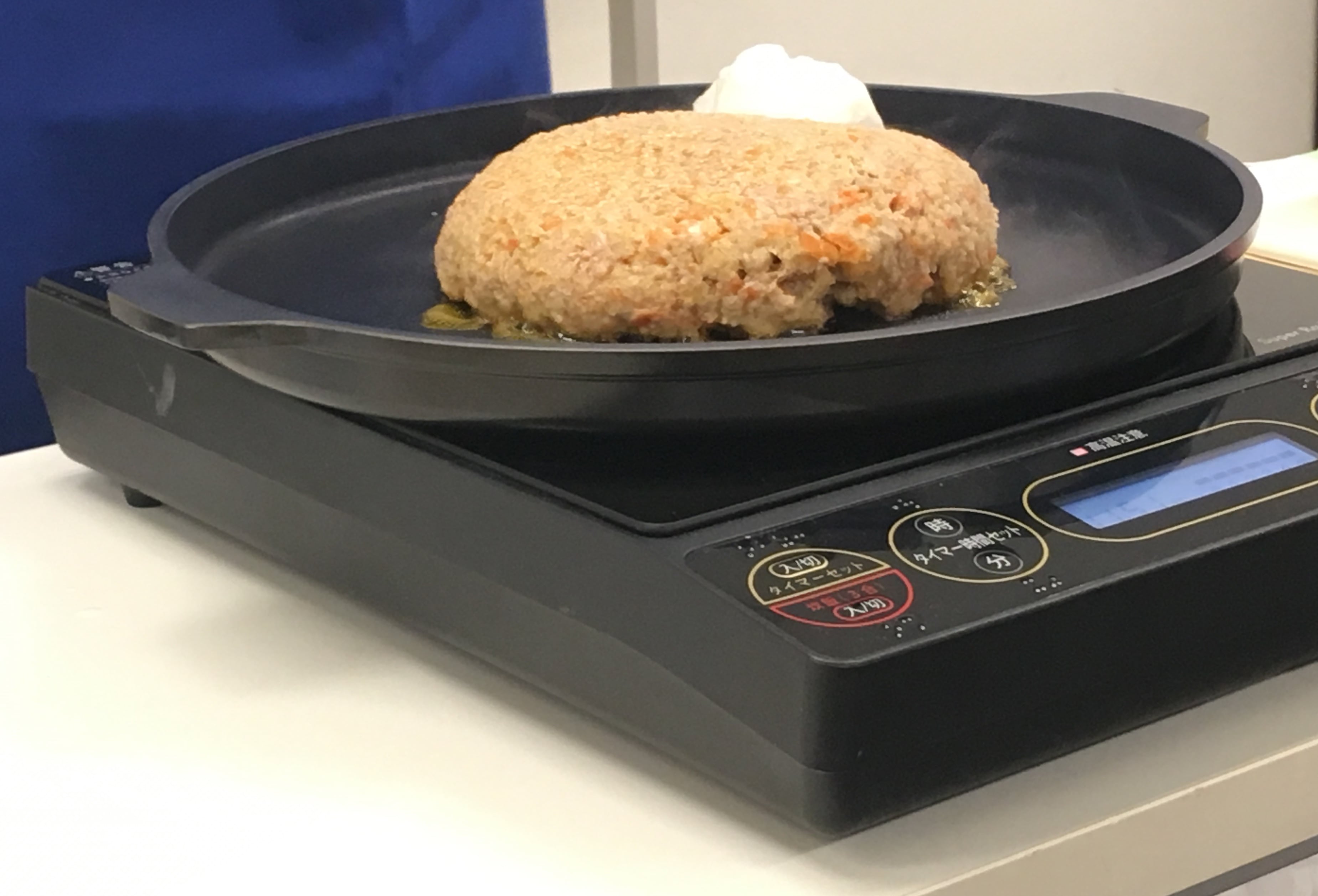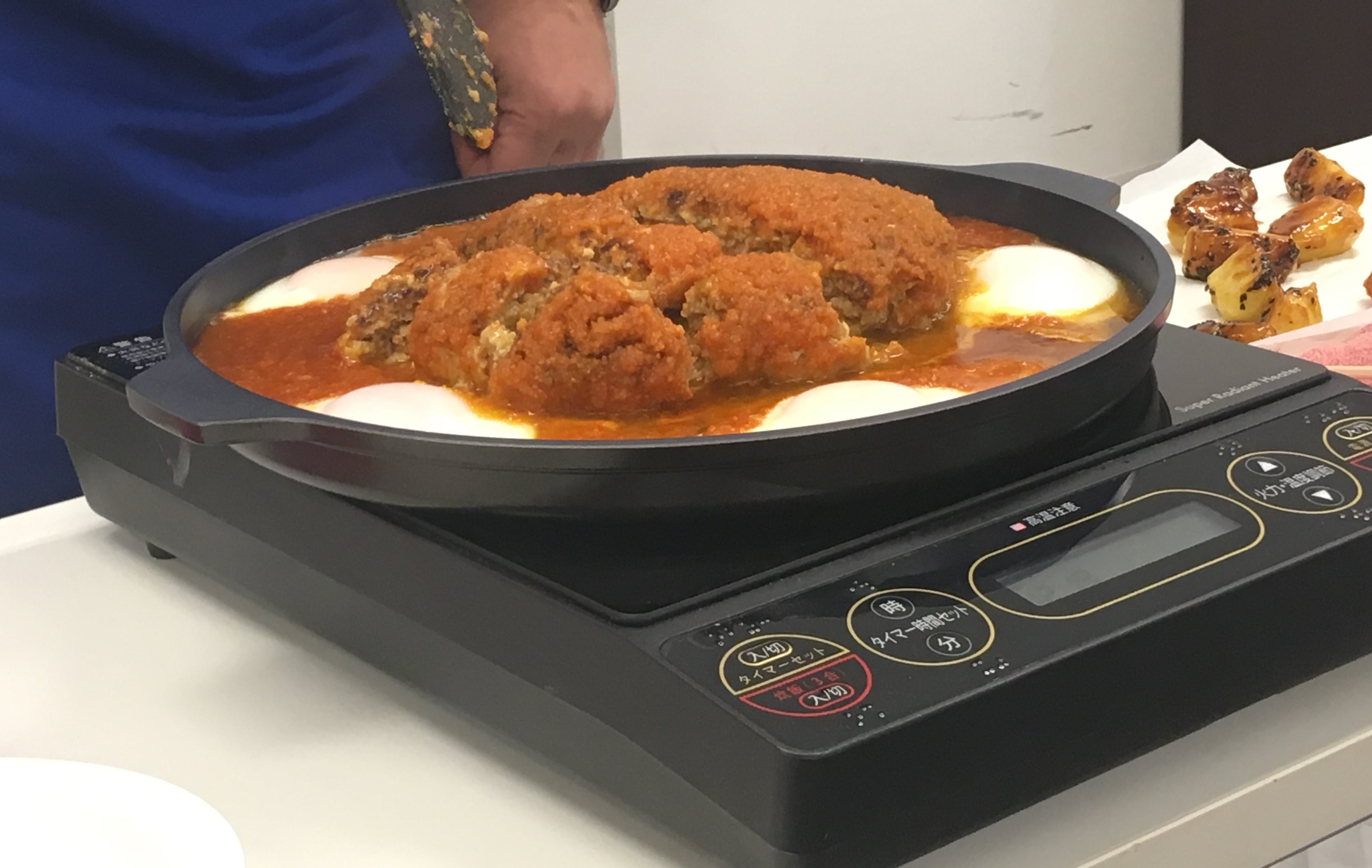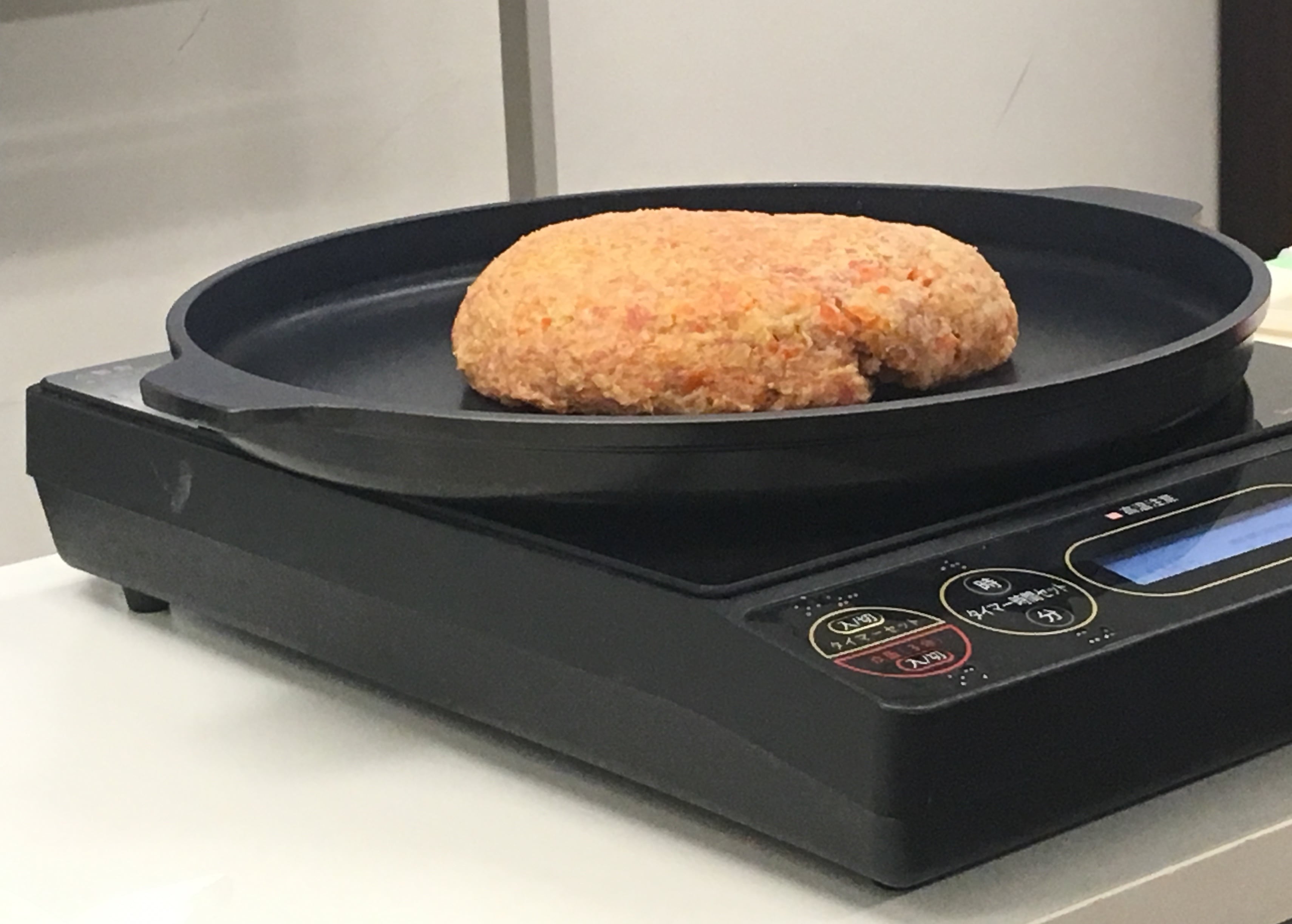 熱の伝わり方を体感していただくために、実演会の場ではハンバーグをスーパーラジエントヒーターを使って調理します。ハンバーグは中まで火を通すのが難しく、料理が下手ですと中が生焼けになってしまうこともあります。そのようなハンバーグを、写真の通り分厚い状態で調理します。