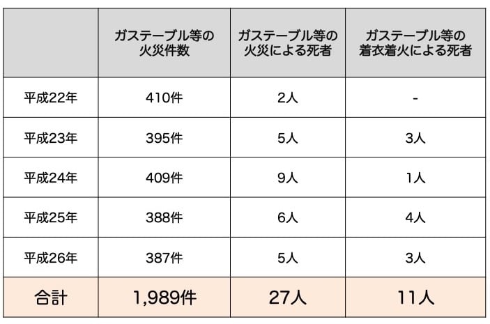 データを見ていただくと分かりますが、ガステーブルによる事故は減ることなく毎年のように起きているのです。しかも、認知能力の低下している高齢者に起きやすい事故です。