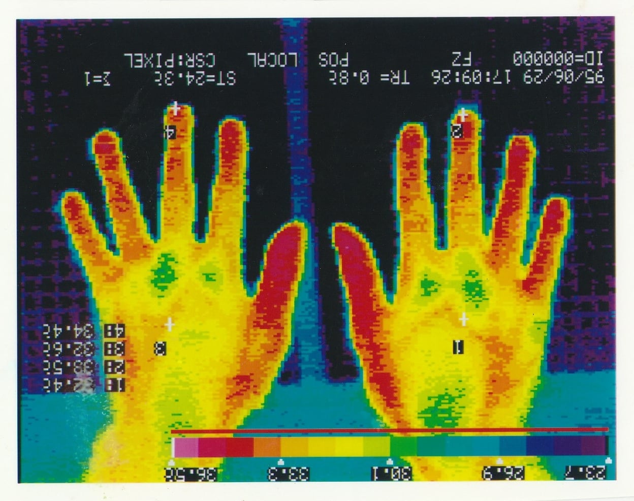 サーモグラフィーは、物体から出される赤外線を検知し、その強さに応じて赤とか黄色でマッピングしているのです。上の写真を見ていただくとわかるように、人間の身体からも少なからず遠赤外線を出しているのです。