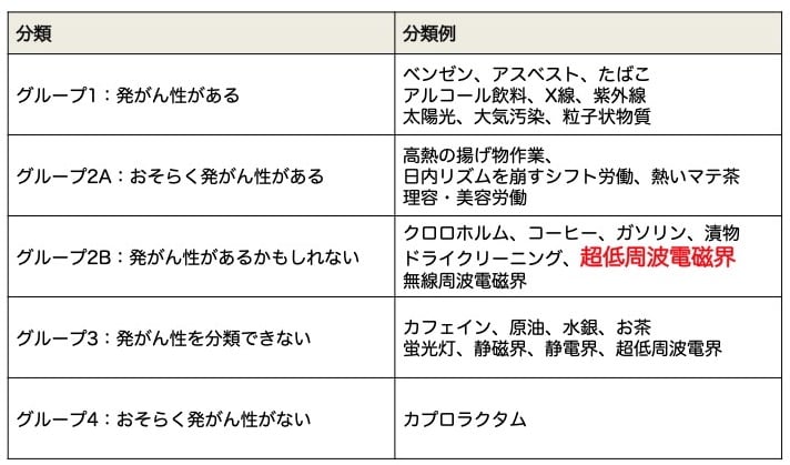 WHOの下部組織である国際がん研究機関(IARC)においても、こういった極低周波の電磁波による発がん性を「グループ2B:発がん性があるかもしれない」に分類しています。