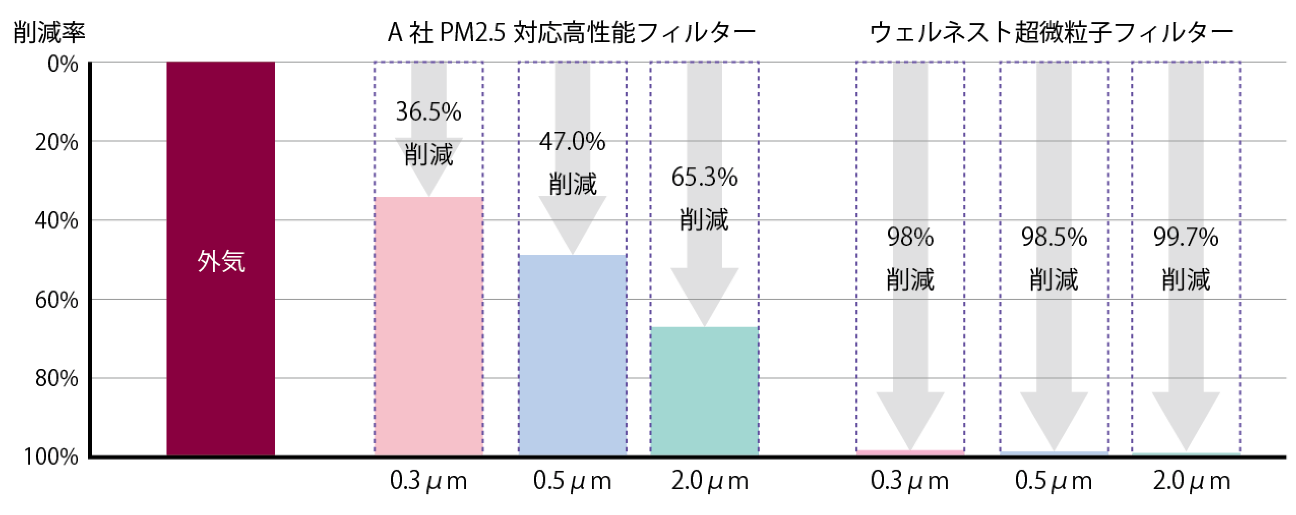 高性能フィルターで約99%の汚染物質をカットできる