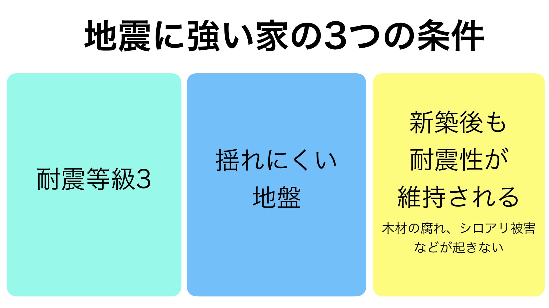 最後におさらいとして、地震に強い家が備えるべき条件を3つにまとめました。