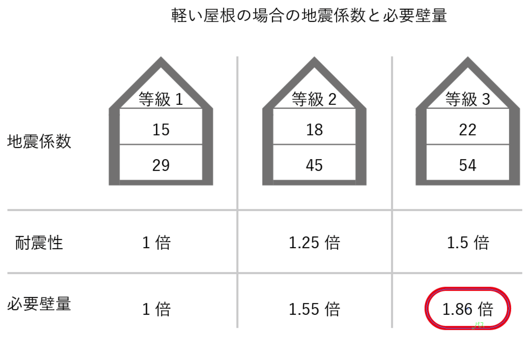 木造住宅においては、耐力壁は多ければ多いほど耐震性能としては有利に働きます。そのため、大地震の被害が発生するごとに、耐力壁の必要量が改定されてきました。また、現在では最低基準の耐震等級1の上に耐震等級2、耐震等級3が設けられています。 上記表のように、耐力壁が増えるごとに耐震等級が上がっていくようになっています。 (耐震等級3の場合、必要となる1階の耐力壁は等級1の約1.86倍)