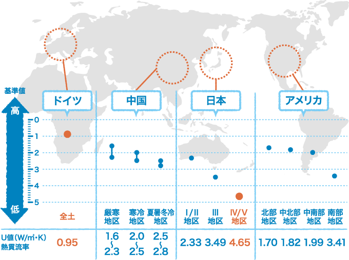 出典:YKK AP調べ[YKK AP 樹脂窓の歴史](ドイツ:建築物のエネルギー性能に関するEU指令(2014年予定)、中国:第12期5カ年(2011〜2015)、日本:平成11年次世代省エネ基準、アメリカ:EPA/DOEエネルギー省計画)