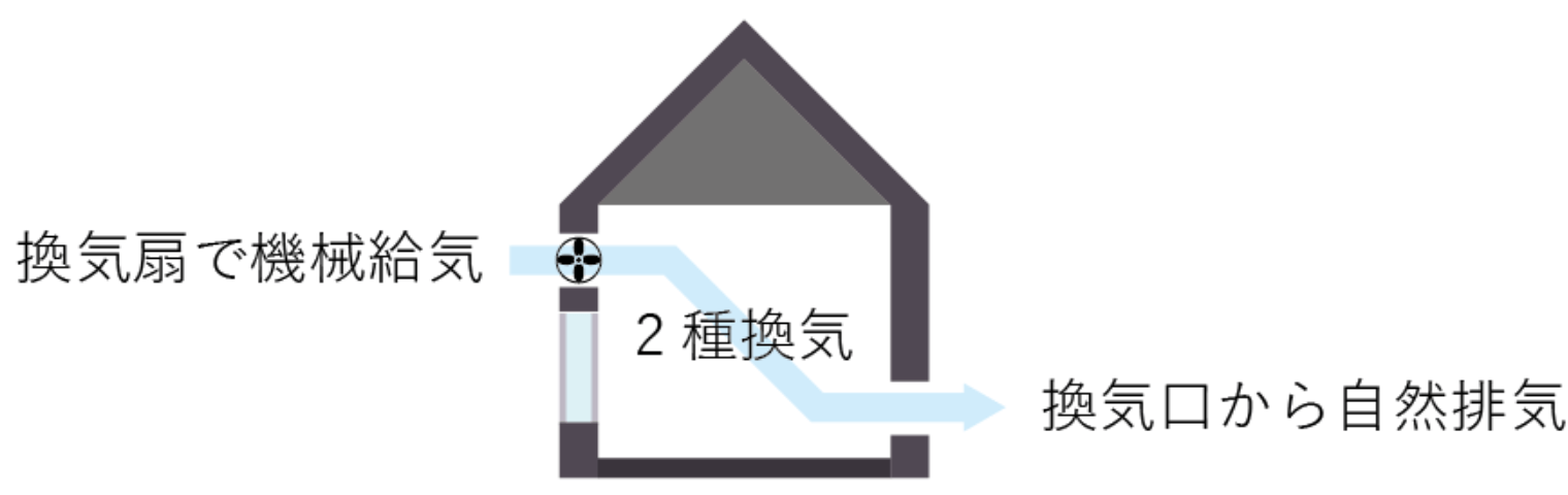 第2種換気とは、屋外から取り込む空気「給気」側のみを換気扇で行います。屋内の汚れた空気は正圧(給気の押し出す力)によって、各部屋に開いている換気口から自然と押し出されます。
