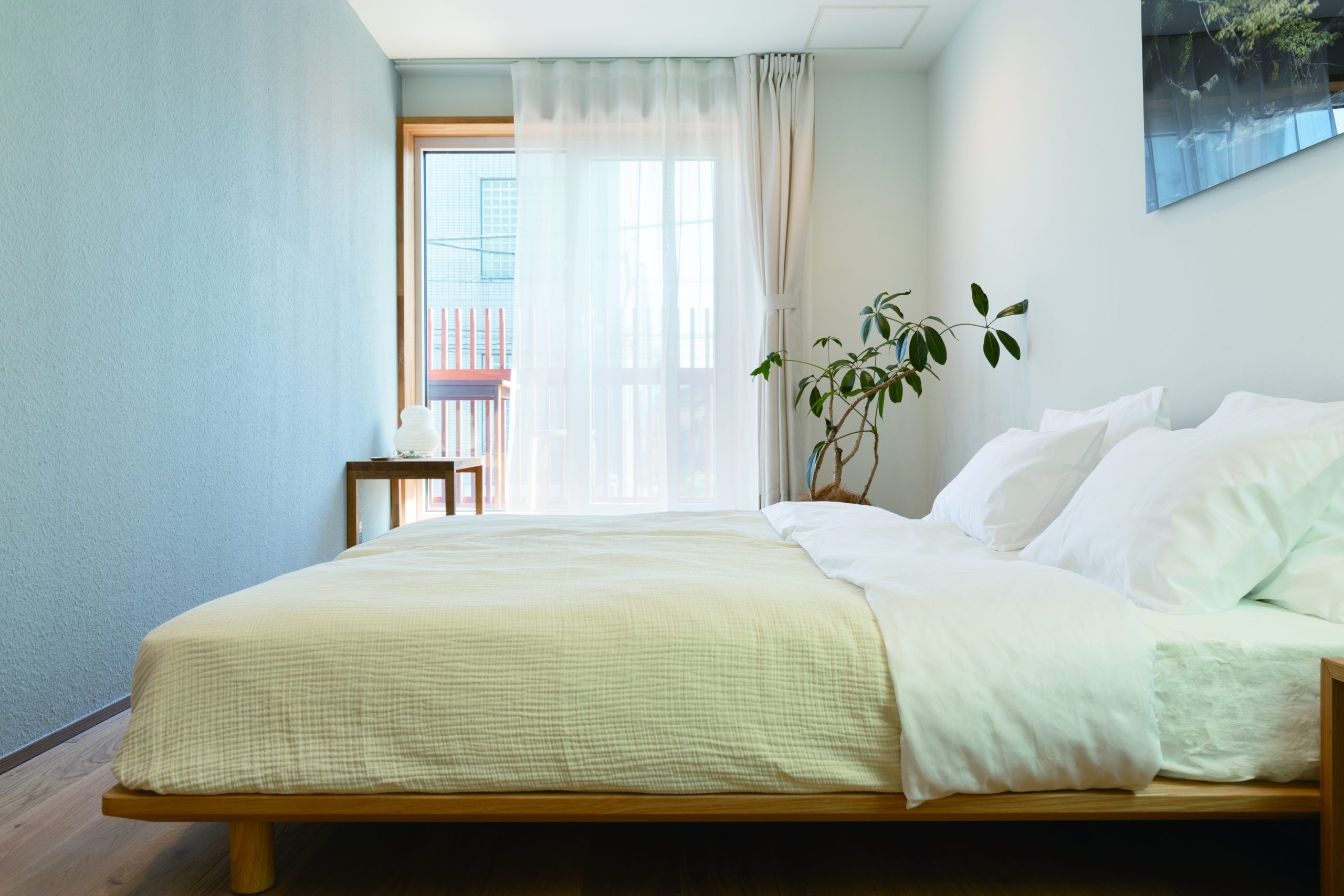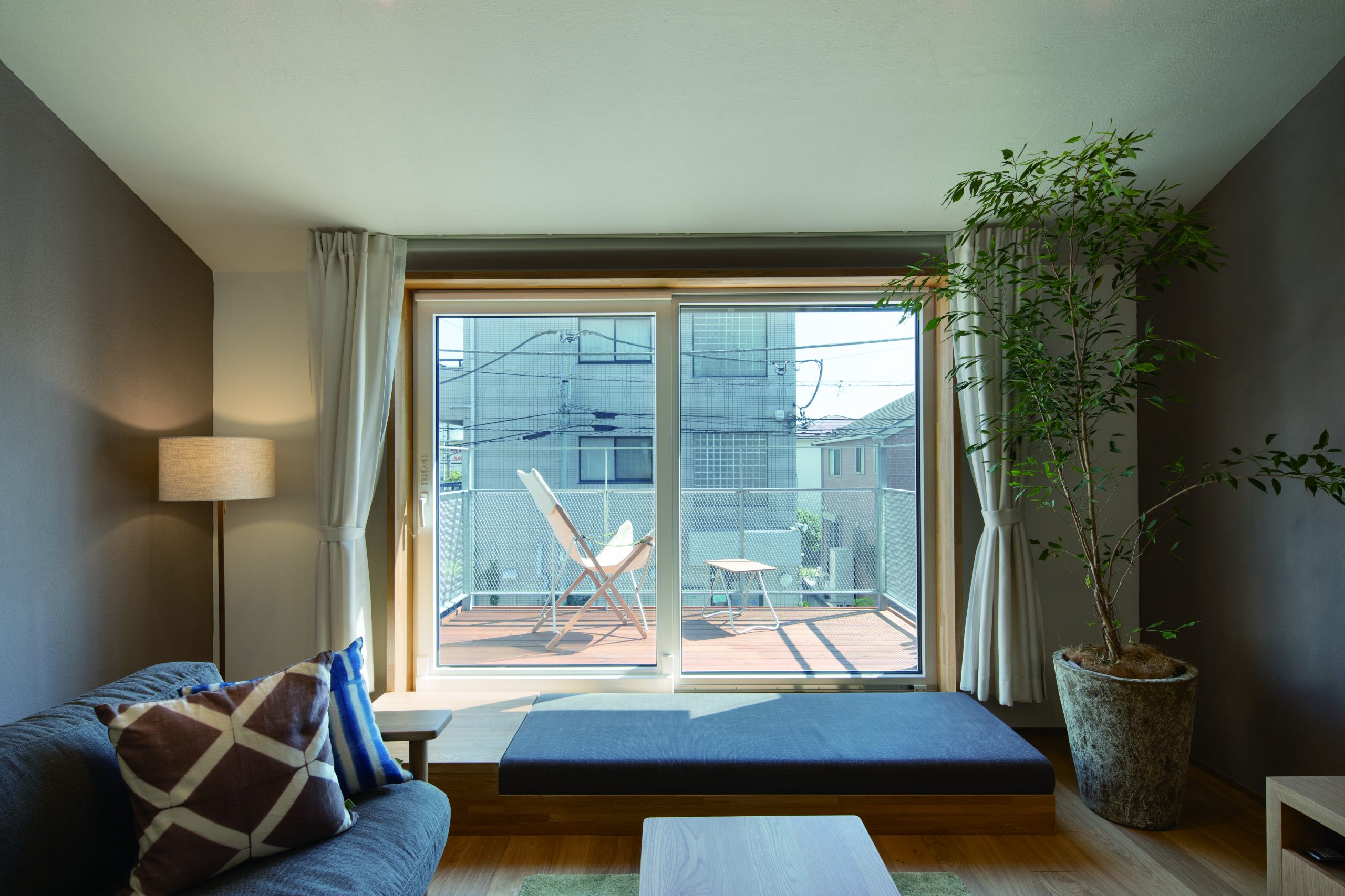 バルコニーにつながる室内側の窓には、段差を生かしたデイベッドを置き、自然と窓周りに人が集まる仕掛けになっています。通常、こういった窓は、床に対してフラットになるよう設置しますが、そうすると窓周りが熱伝導、つまりヒートブリッジ(暑い時期は熱橋、寒い時期は冷橋と言われます)となり、窓周りの温度を急激に上げたり、下げたりしています。