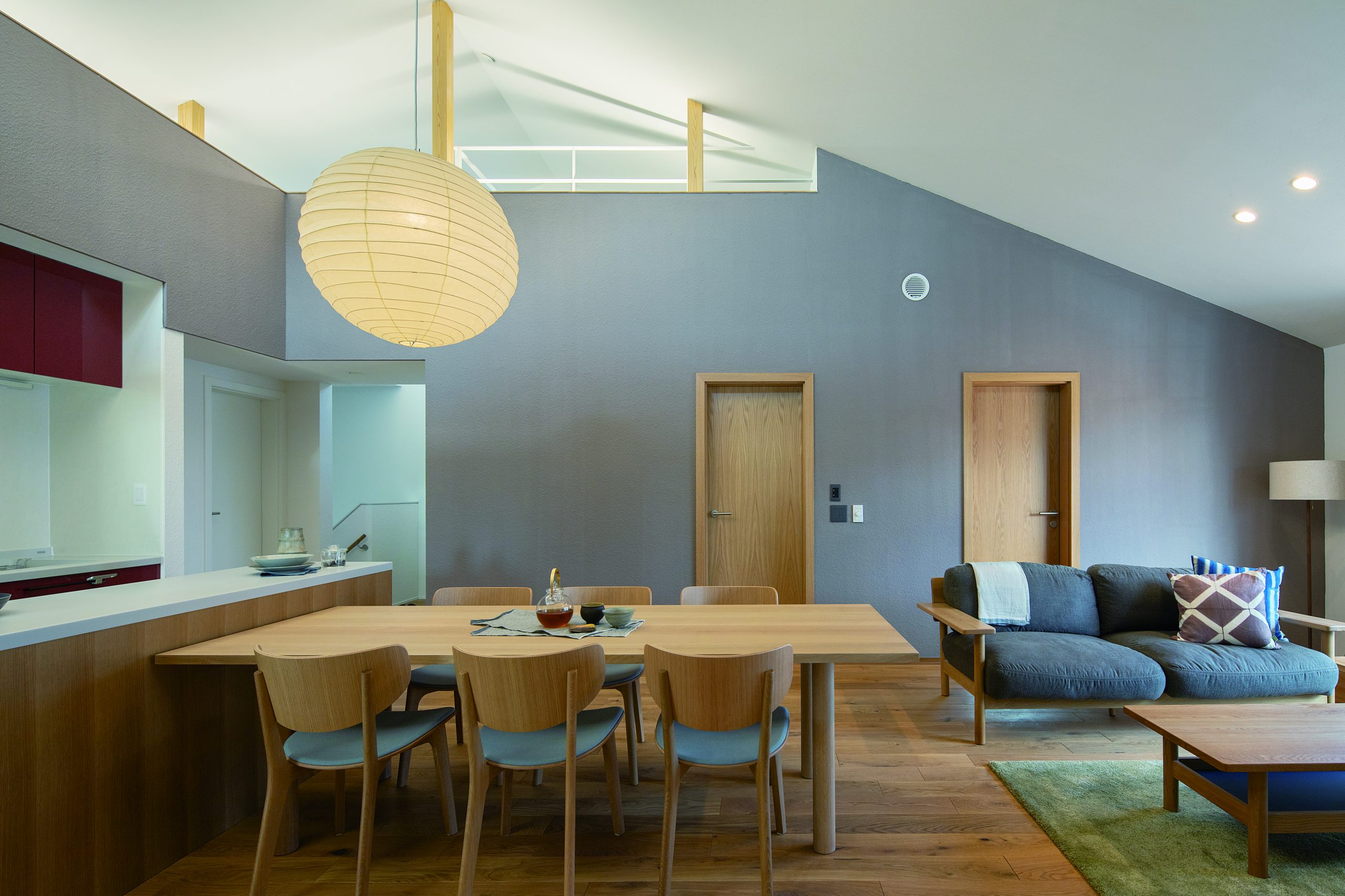 このリビングで一番驚きなのは、勾配天井です。「いったいぜんたい何メートルあるんだ?!」っていうくらい贅沢な空間が広がります!吹き抜けをつくらない代わりに、大きな勾配天井をつくってみたんです。