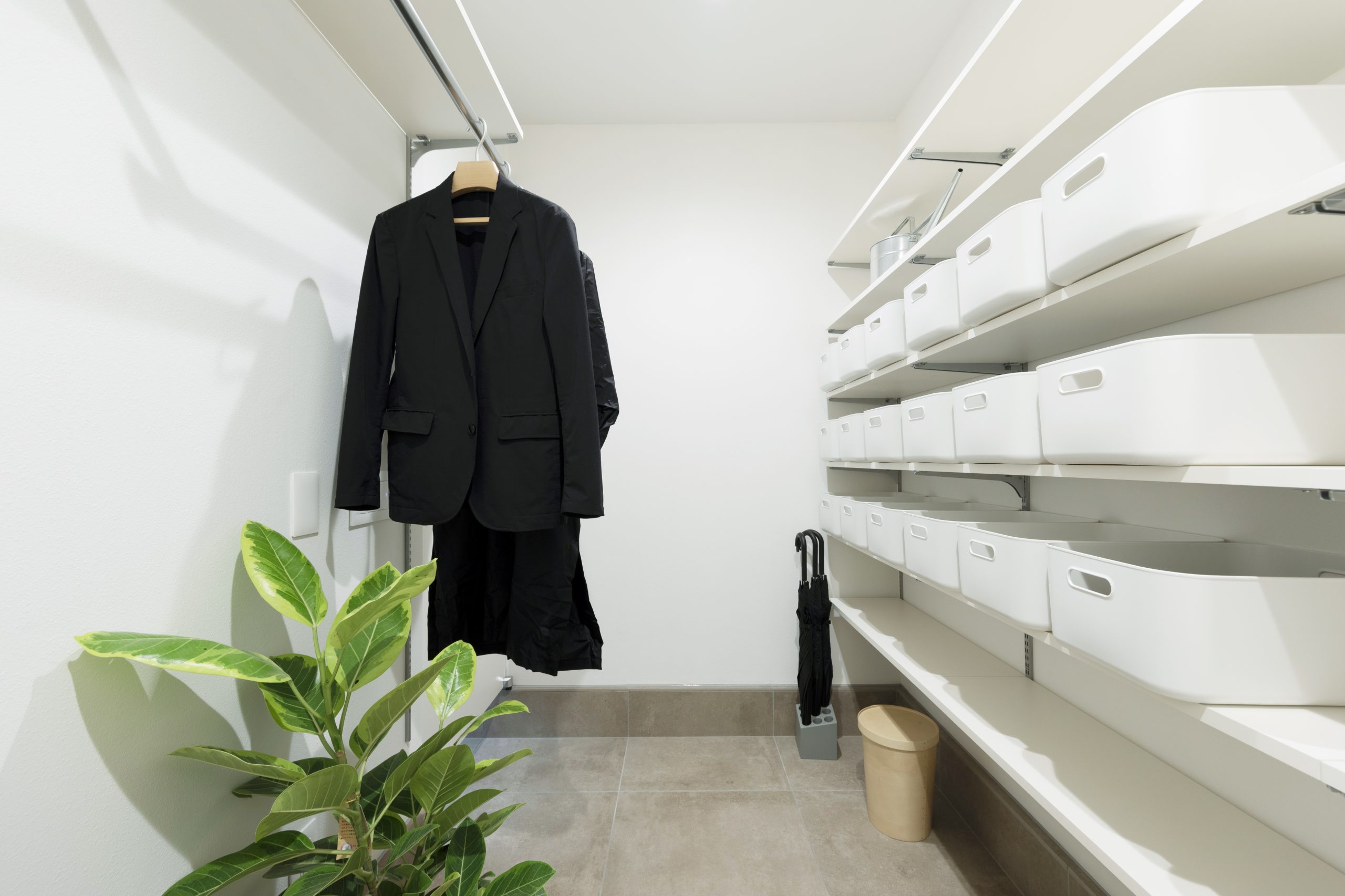 入って左側には、ぐるっと回れる回遊型の玄関収納があり、靴やコートを置くことができます。