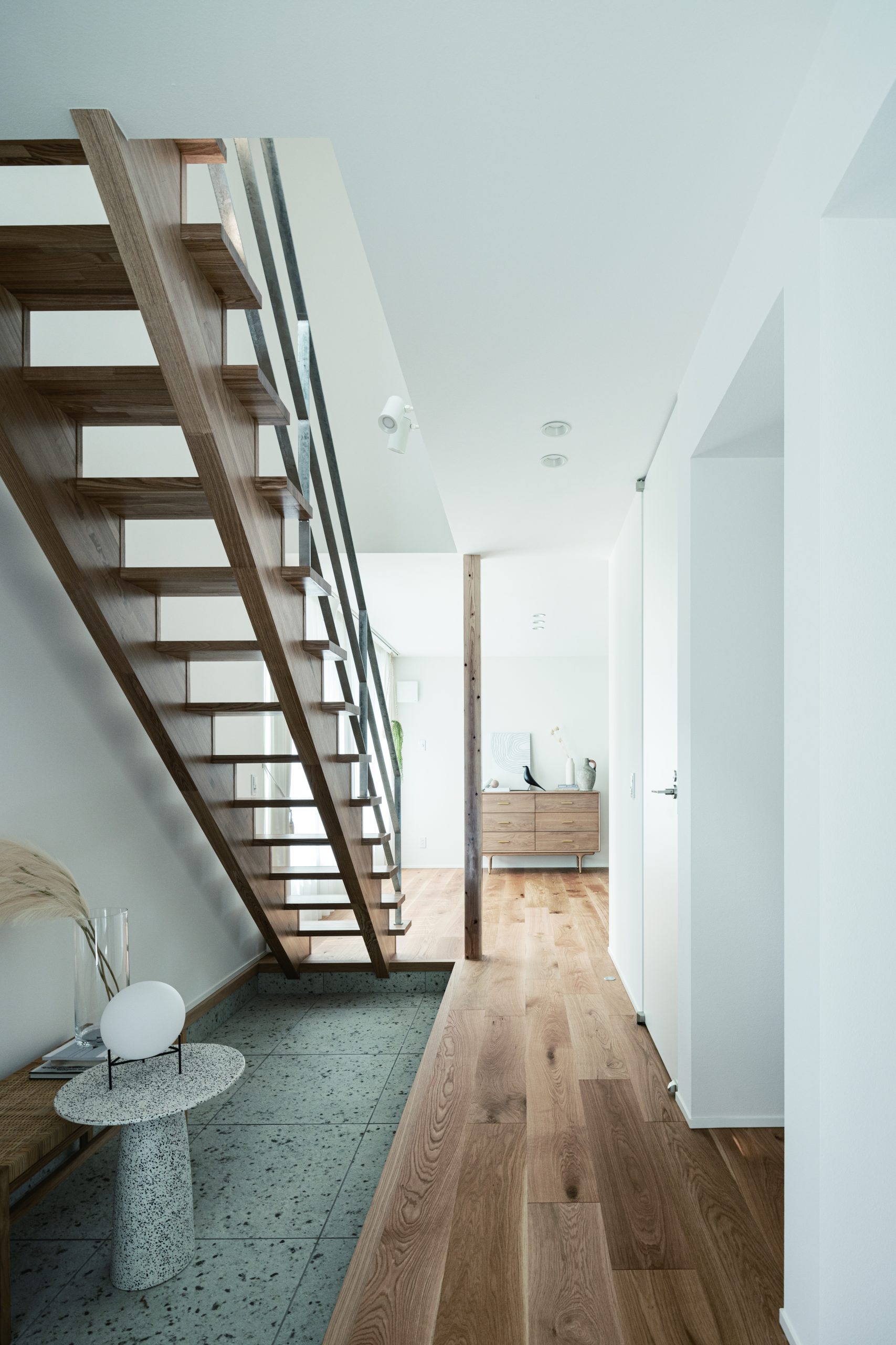 アプローチはアルコーブになっています。住宅が密集したエリアでは、庇を出すと越境する可能性があるので、内側に窪ませた形はおすすめです。ただし、アルコーブは外気と接する部分になるので、断熱をしっかりと施す必要があり、その分の費用はかかってしまいます。