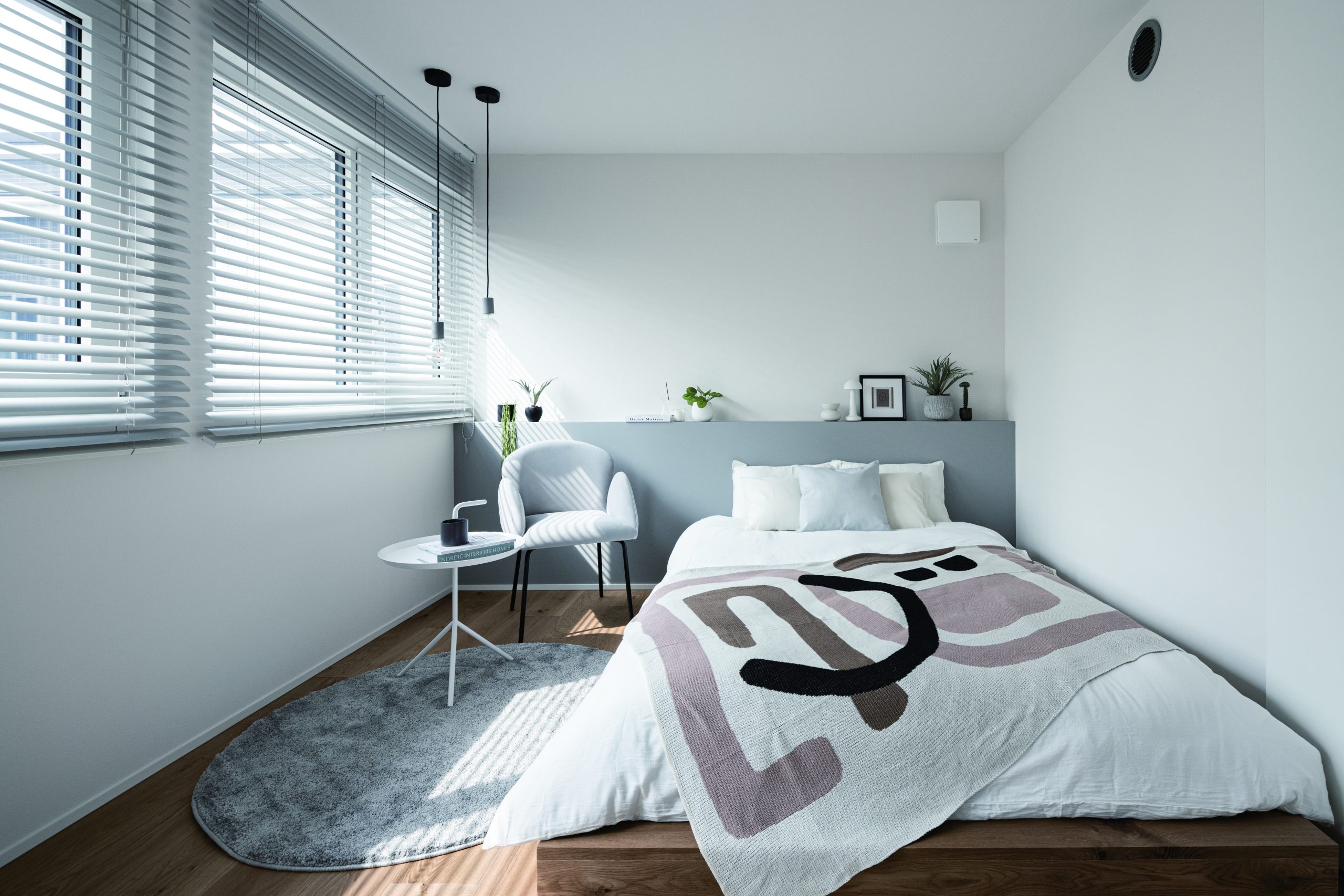ベッドのヘッドボードがなくてもいいように、グレーの台は造作しました。