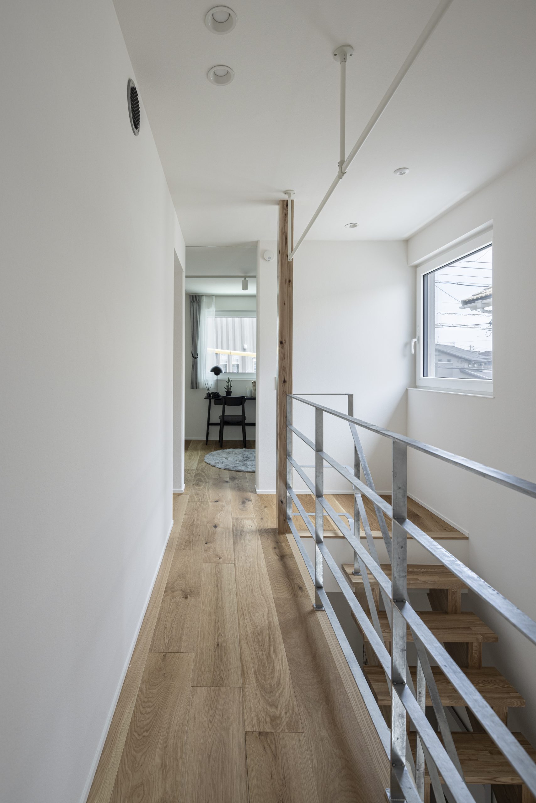 機械室の隣は浴室と洗濯室です。洗濯物は洗濯室にも干せますし、階段横のホールの天井に設置してあるランドリーパイプに干すこともできます。階段の手すりにハンガーを引っかけて干す方がいらっしゃるかと思いますが、だったら最初から干せるようにしたらいいんじゃないか、という提案です。
