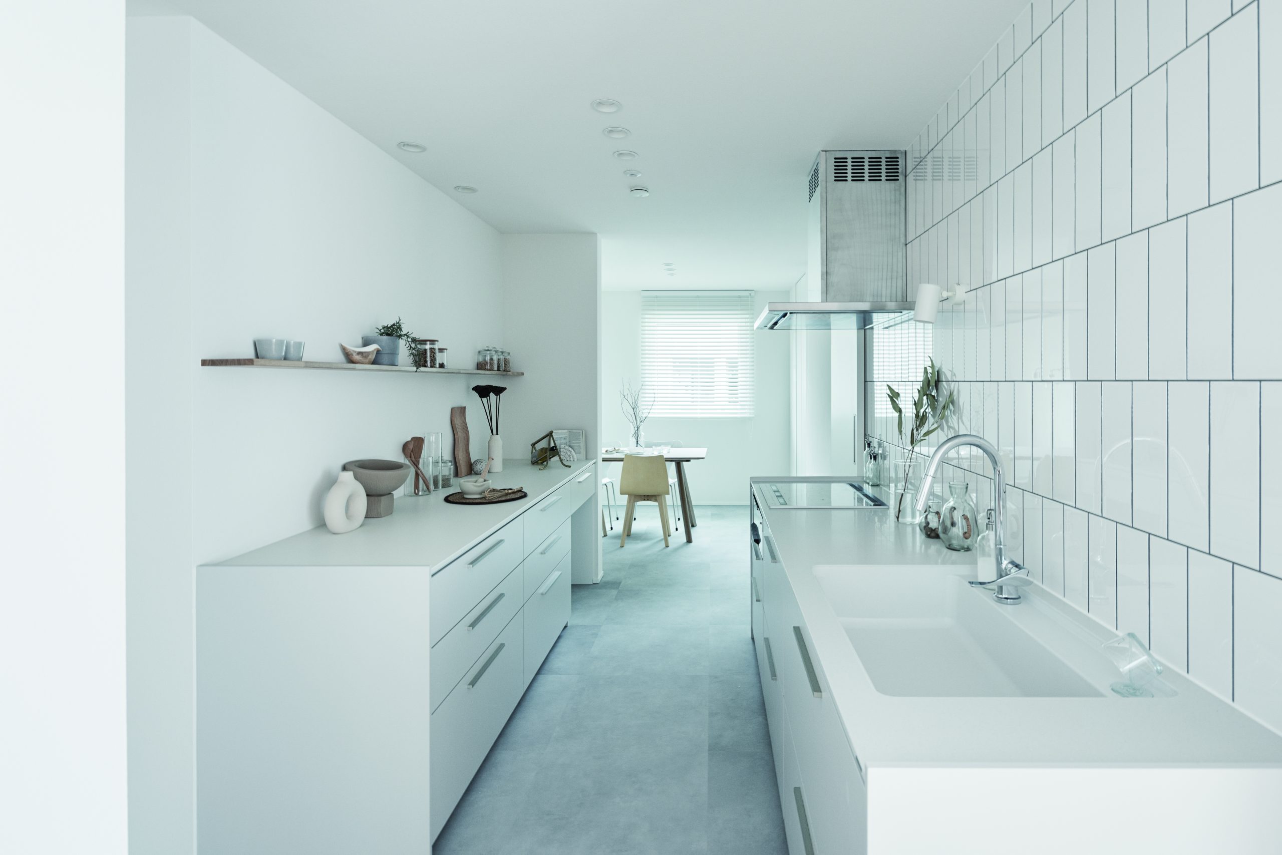 リビングの隣には人感センサーのついたキッチンがあり、その隣がダイニングになっています。キッチンを挟んで、リビングとダイニングが離れている間取りなので、住む人は思い思いの場所で、お互いの気配を感じながらも、ほどよい距離感で過ごすことができます。