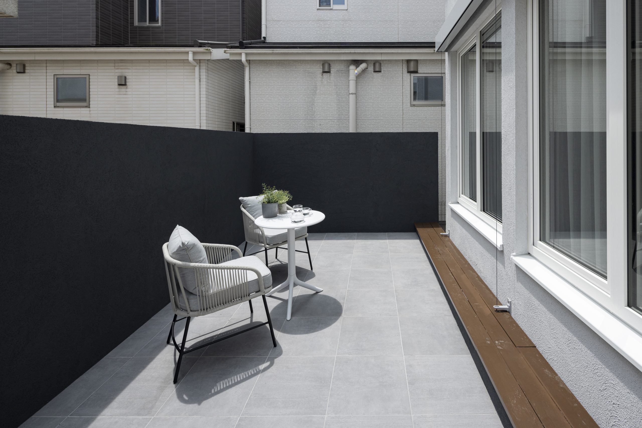黒い塀をつくって、隣家や外からの視線は遮られるようになっているので、ここでお茶を飲んだり、ビールを飲んだり、気持ちよく寛げるスぺ―スになっています。