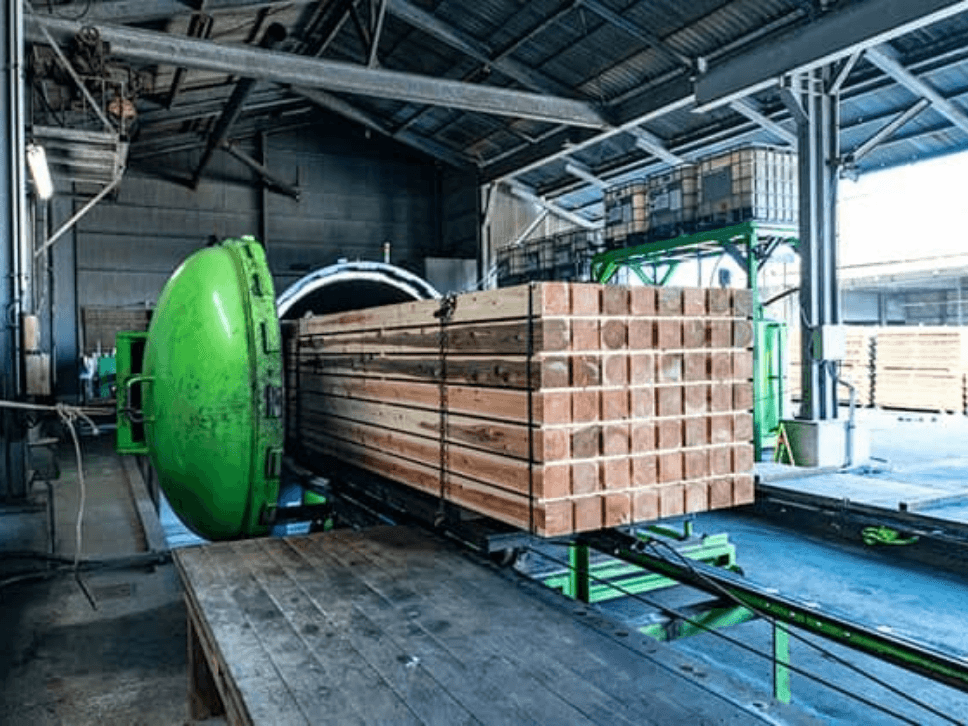 緑の柱は、木材を釜に入れ、高い圧力をかけながら薬剤を木材内部に浸透させる「加圧注入処理」を施しています。そのため木材の深部にまで薬剤が浸透し、新築時の耐久性を半永久的に維持します。一般的に行われている「塗布処理」では、表面に1mmほどしか浸透しません。