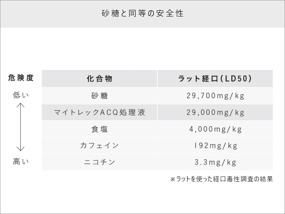 緑の柱に使用している薬剤は、砂糖と同等の安全性を持つ「マイトレックACQ処理液」。右の表はラットを使った経口毒性調査(LD50※1)で、他の化学物質と比較したものです。数値が小さいほど毒性が強く、大きいほど毒性が弱いことを表していますが、砂糖と同等の安全性を示しています。