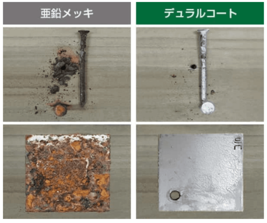 木材を固定する金物がさびてしまうと、家の強度は低下してしまいます。腐食促進試験の結果によると、一般的な金物は20年ほどで赤錆が発生し始めるのに対し、ウェルネストホームが採用する「デュラルコートHG」は50年相当の試験でも赤錆の発生はわずか。長期間にわたり強度を保ちます。